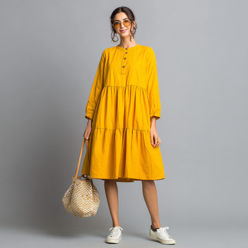 Brighten up your wardrobe with this Misslook Yellow Cotton Casual Dress. Made from lightweight, breathable cotton, this vibrant dress is perfect for sunny days or casual outings. Its flattering fit and cheerful yellow color effortlessly combine style and comfort.